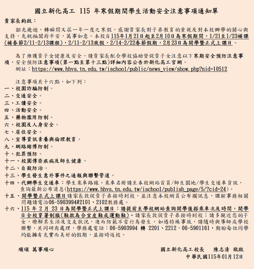 【國立新化高工 115 年寒假期間學生活動安全注意事項通知單暨各級學校115寒假期間學生活動安全注意事項】